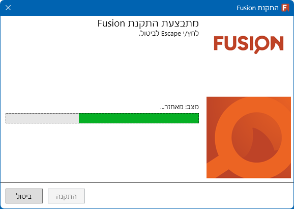 לדוגמה, אם בזמן ההתקנה נבחרה השפה Arabic שבחלונית Option/אפשרויות, ובלשונית תבנית שבחלונית איזור נבחרה השפה ערבית, אזי תפריטי FUSION יהיו בשפה הערבית. - יש להמתין לסיום ההתקנה שבמהלכה יושמעו צלילי התקדמות.