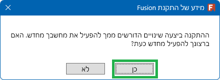 - עם סיום ההתקנה תופיע חלונית של בקשת הפעלה מחדש של Windows, יש ללחוץ על כפתור כן.